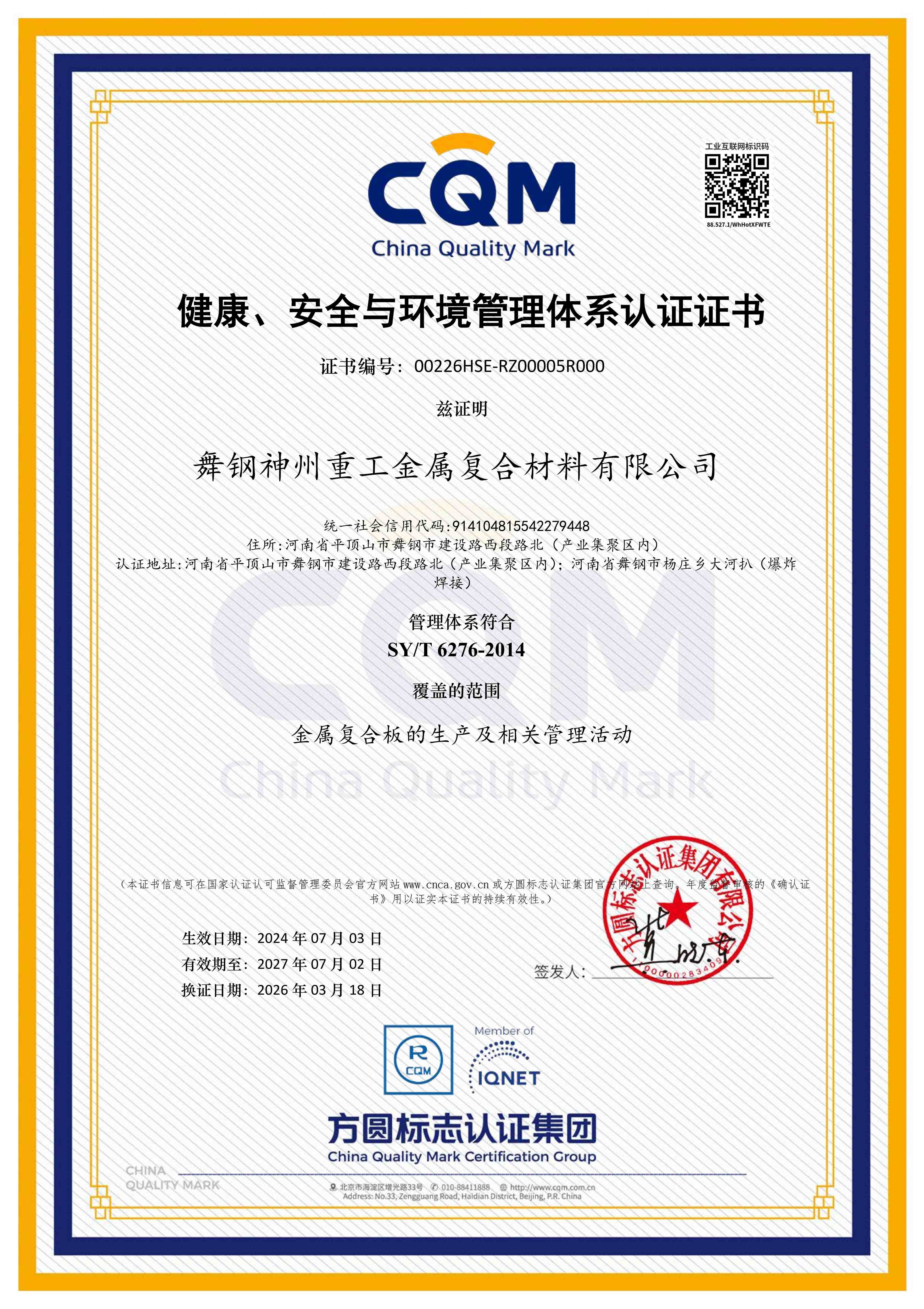 企业位于河南省舞钢市产业集聚区,占地面积90000㎡,在舞钢市境内建有三处设施齐全,位置优越的爆炸焊接生产基地,建有一流的生产装备,现代化厂房和办公配套设施;拥有物理、化学、无损检测等先进的检测设备;年可生产爆炸焊接金属复合材料5万吨以上,年产值8亿元。生产过程严格执行国家标准、行业标准以及企业内部标准;产品出厂合格率100%。